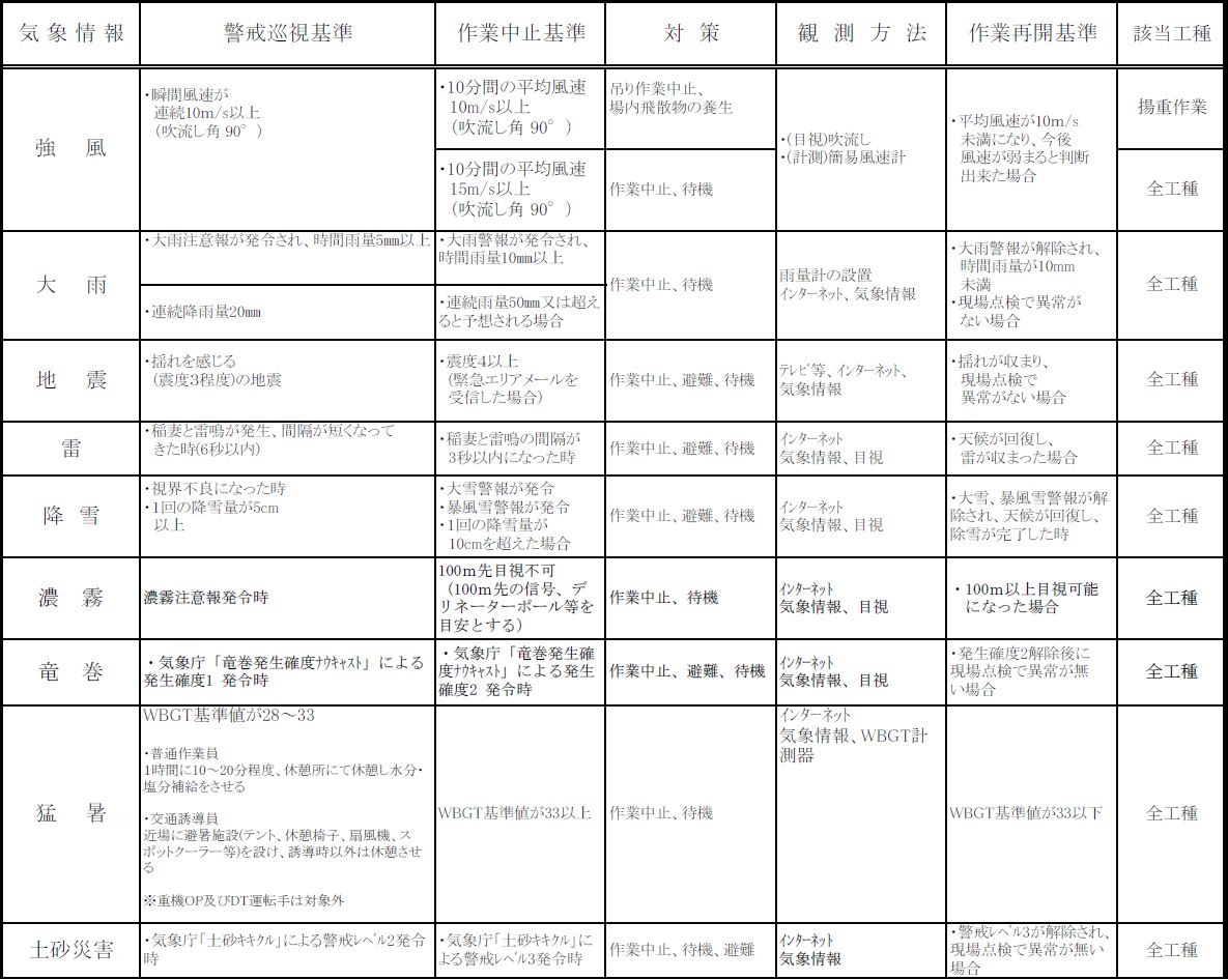 1. 下記の悪天候の時、作業の実施に危険が予想される時は、作業を一時中止する。